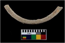 | Description / विवरण | Fragment of an undecorated shell bangle. It is creamish in colour and rectangular in cross section. |