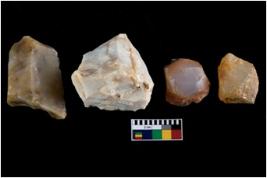 | Description / विवरण | There are n-4 of intact flake cores. Out of them 1 is made up Chalcedony and 3 are made up of Chert.There are multidirectional irregular dominant scar pattern on both dorsal and ventral face of the cores. |