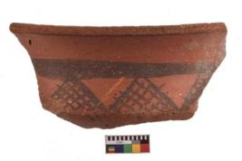 | Description / विवरण | Specimen of black on red ware with decorative geometric Latticed loops set in two horizontal bands painting. |