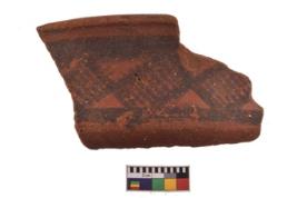 | Description / विवरण | Specimen of black on red ware with decorative geometric A row of latticed diamands set in horizantal bands but having groups of oblique lines at intervals painting. |