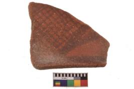 | Description / विवरण | Specimen of black on red ware with decorative geometric A row of latticed diamands set in horizantal bands but having groups of oblique lines at intervals painting. |