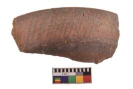 | Description / विवरण | Specimen of black on red ware with decorative geometric Out curved lines painting. |