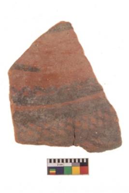 | Description / विवरण | Specimen of potsherd with black decorative geometric painting. Type Black on Red Ware . |