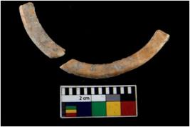 | Description / विवरण | Fragment of an undecorated shell bangle. It is creamish in colour and rectangular in cross section. |