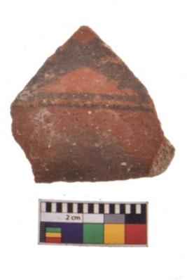 | Description / विवरण | Specimen of black on red ware with decorative geometric A row of latticed diamonds set in horizontal bands but having groups of oblique lines at intervals painting. |