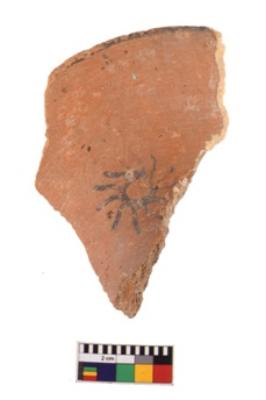| Description / विवरण | A specimen of a potsherd. It is reddish in colour with black decorative nature painting on it. |