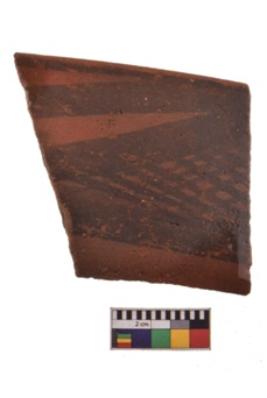 | Description / विवरण | Specimen of black on red ware with decorative geometric A row of latticed diamonds set in horizontal bands but having groups of oblique lines at intervals painting. |