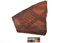 | Description / विवरण | Specimen of black on red ware with decorative geometric A row of latticed diamonds set in horizontal bands but having groups of oblique lines at intervals painting. |