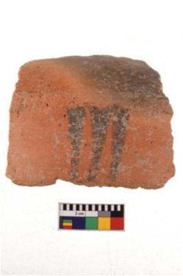 | Description / विवरण | A specimen of a potsherd. It is reddish in colour with black decorative geometric painting on it. |
