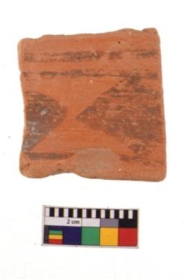| Description / विवरण | A specimen of a potsherd. It is reddish in colour with black decorative geometric painting on it. |