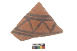 | Description / विवरण | A fragment of a potsherd. It is reddish in colour with black decorative geometric painting on it. |