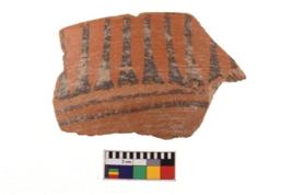 | Description / विवरण | A specimen of a potsherd. It is reddish in colour with black decorative geometric painting on it. |