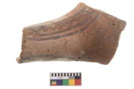 | Description / विवरण | A fragment of a potsherd. It is reddish in colour with black decorative geometric painting on it. |
