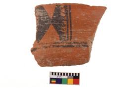 | Description / विवरण | A specimen of a potsherd. It is reddish in colour with black decorative geometric painting on it. |