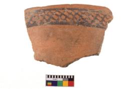 | Description / विवरण | A specimen of a potsherd. It is reddish in colour with black decorative geometric painting on it. |
