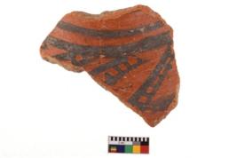 | Description / विवरण | A specimen of a potsherd. It is reddish in colour with black decorative geometric painting on it. |