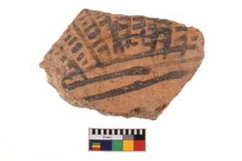 | Description / विवरण | A specimen of a potsherd. It is reddish in colour with black decorative geometric painting on it. |