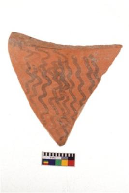 | Description / विवरण | A specimen of a potsherd. It is reddish in colour with black decorative geometric painting on it. |