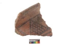 | Description / विवरण | A fragment of a potsherd. It is reddish in colour with black decorative geometric painting on it. |