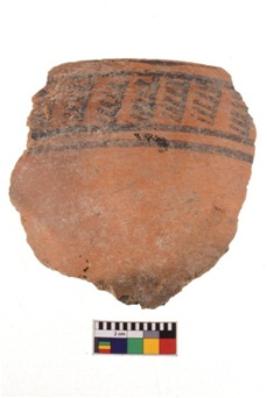 | Description / विवरण | A specimen of a potsherd. It is reddish in colour with black decorative geometric painting on it. |