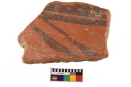 | Description / विवरण | A specimen of a potsherd. It is reddish in colour with black decorative geometric painting on it. |