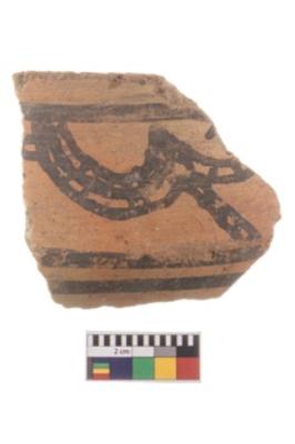 | Description / विवरण | A fragment of a potsherd. It is reddish in colour with black decorative geometric painting on it. |