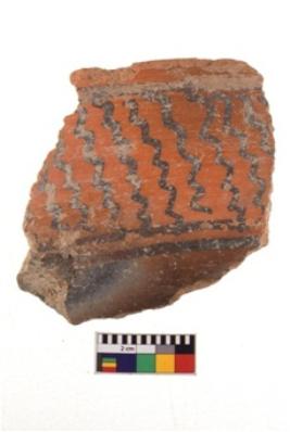 | Description / विवरण | A specimen of a potsherd. It is reddish in colour with black decorative geometric painting on it. |