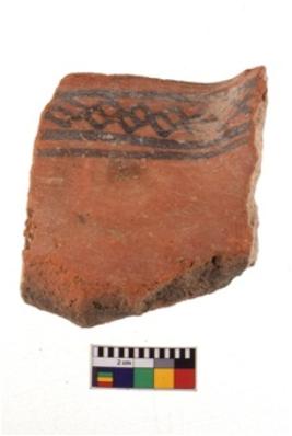 | Description / विवरण | A specimen of a potsherd. It is reddish in colour with black decorative geometric painting on it. |
