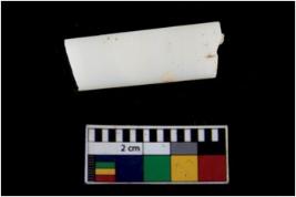 | Description / विवरण | Fragment of an undecorated shell bangle. It is creamish in colour and rectangular in cross section. |