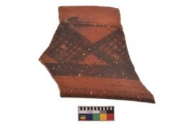 | Description / विवरण | Specimen of black on red ware with decorative geometric A row of latticed diamonds set in horizontal bands but having groups of oblique lines at intervals painting. |