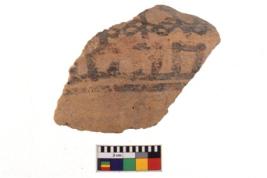 | Description / विवरण | A specimen of a potsherd. It is reddish in colour with black decorative geometric painting on it. |