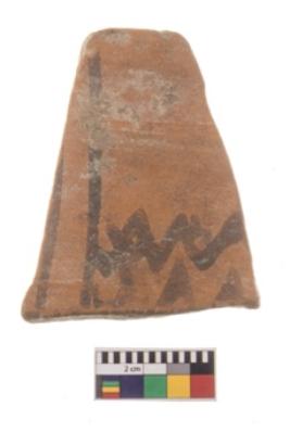 | Description / विवरण | A fragment of a potsherd. It is reddish in colour with black decorative geometric painting on it. |