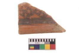 | Description / विवरण | A fragment of a potsherd. It is reddish in colour with black decorative geometric painting on it. |
