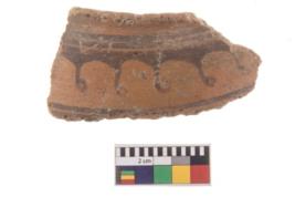| Description / विवरण | A fragment of a potsherd. It is reddish in colour with black decorative geometric painting on it. |