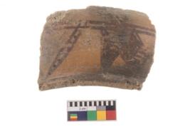 | Description / विवरण | A fragment of a potsherd. It is reddish in colour with black decorative geometric painting on it. |