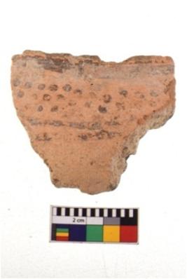 | Description / विवरण | A specimen of a potsherd. It is reddish in colour with black decorative geometric painting on it. |