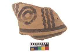 | Description / विवरण | A fragment of a potsherd. It is reddish in colour with black decorative geometric painting on it. |