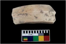 | Description / विवरण | Fragment of an undecorated shell bangle. It is creamish in colour and rectangular in cross section. |