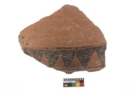 | Description / विवरण | A fragment of a potsherd. It is reddish in colour with black decorative geometric painting on it. |