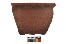 | Description / विवरण | Specimen of black on red ware with decorative geometric Vertical strokes set in two horizontal bands painting. |