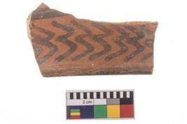 | Description / विवरण | A fragment of a potsherd. It is reddish in colour with black decorative geometric painting on it. |