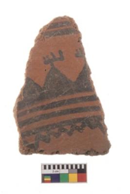 | Description / विवरण | A fragment of a potsherd. It is reddish in colour with black decorative geometric painting on it. |