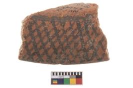 | Description / विवरण | A fragment of a potsherd. It is reddish in colour with black decorative geometric painting on it. |