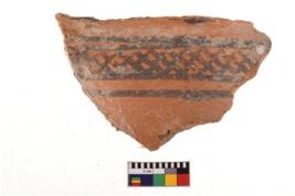 | Description / विवरण | A specimen of a potsherd. It is reddish in colour with black decorative geometric painting on it. |