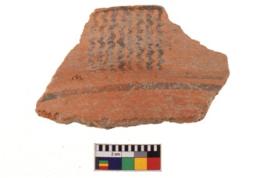 | Description / विवरण | A specimen of a potsherd. It is reddish in colour with black decorative geometric painting on it. |