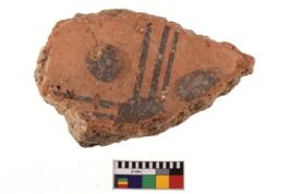 | Description / विवरण | A specimen of a potsherd. It is reddish in colour with black decorative geometric painting on it. |