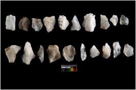 | Description / विवरण | Specimen of flake tools with prominent flaking marks. They are made up of a short flakes with sides trimmed. Some of them are rectangular flakes with wavy thick distal end and broken functional top. |