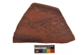 | Description / विवरण | Specimen of black on red ware with decorative geometric A row of latticed diamonds set in horizontal bands but having groups of oblique lines at intervals painting. |