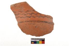 | Description / विवरण | A specimen of a potsherd. It is reddish in colour with black decorative geometric painting on it. |