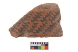 | Description / विवरण | A fragment of a potsherd. It is reddish in colour with black decorative geometric painting on it. |